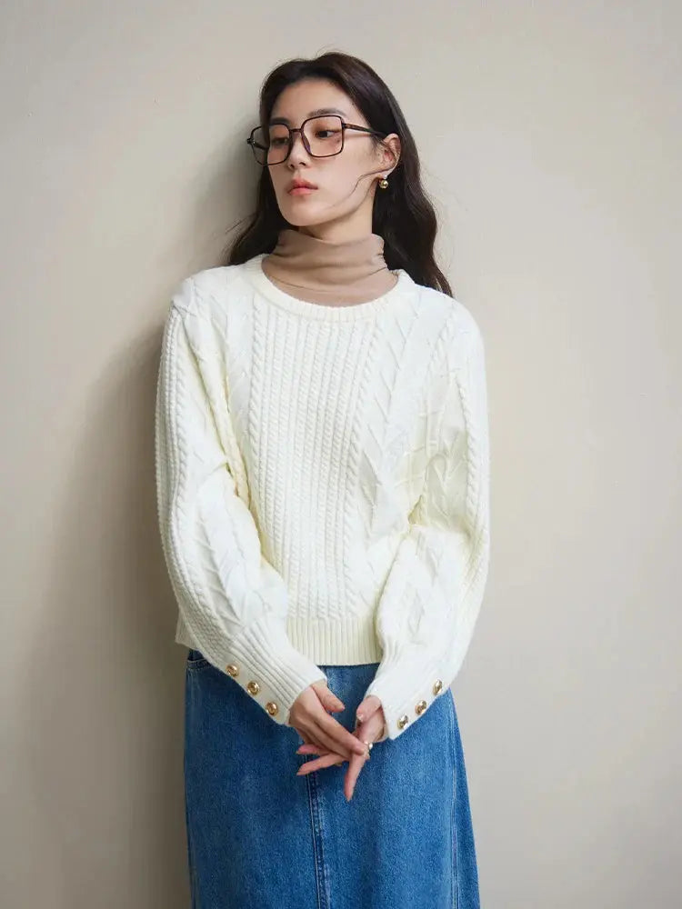The Gentle Cable Knit Wool Sweater combines classic cable knit texture with soft wool for warmth and comfort, making it a timeless piece for cool-weather layering.