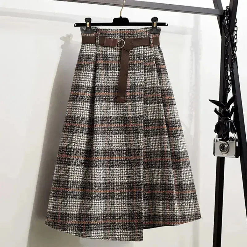 Irregular Hem Wool-Blend Plaid Midi Skirt