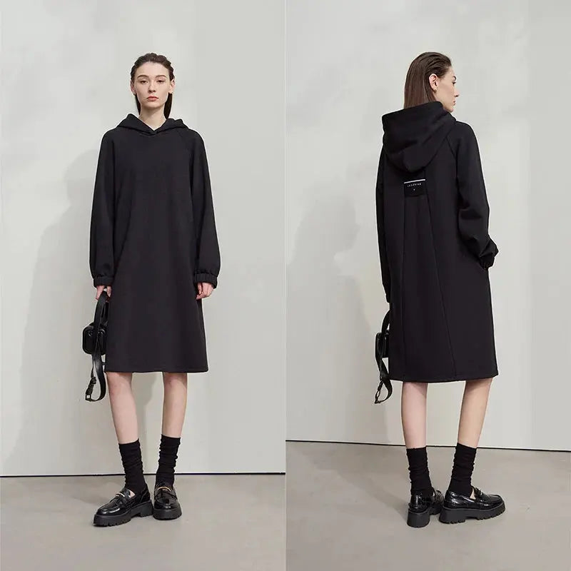 Women's hooded knitted sweater dress combining warmth and style. This cozy knit features a functional hood for extra coverage. Ideal for layering or wearing solo during chilly seasons.